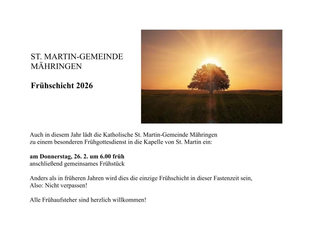Donnerstag, 26. Februar um 6.00 Uhr Frühschicht in der Fastenzeit, anschließend Frühstück in St. Martin am Berg